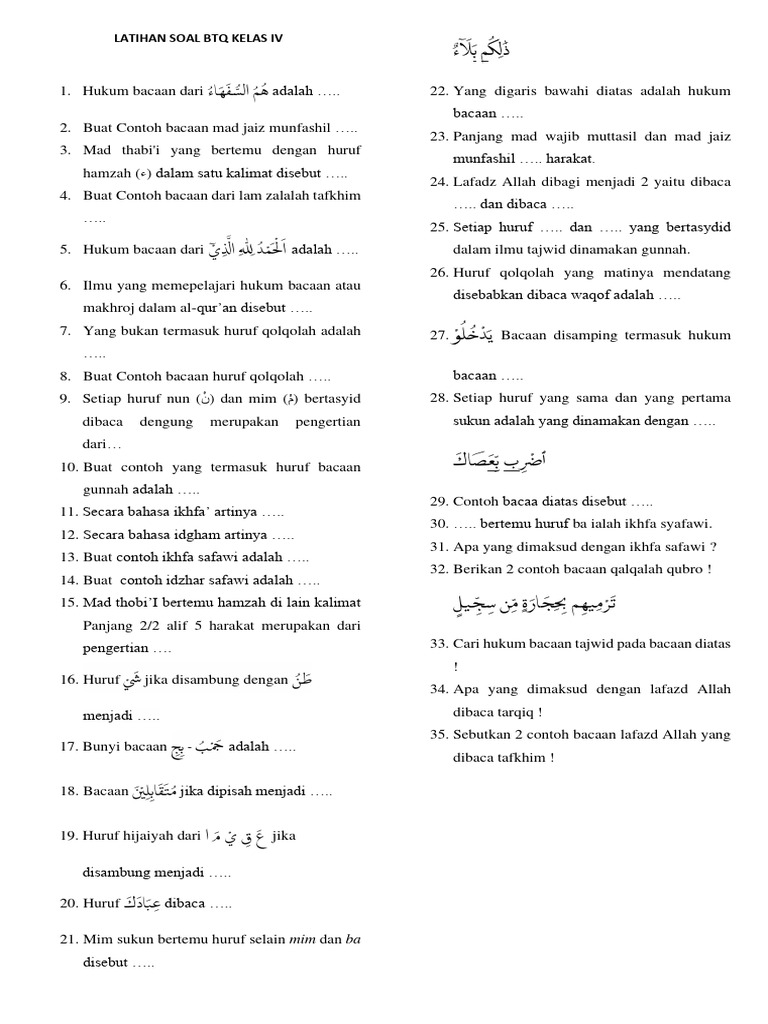 Artikel ini akan membahas secara mendalam mengapa Surat Al-Kafirun sangat cocok untuk materi BTQ kelas 4, bagaimana pendekatan pengajarannya, serta menyajikan berbagai contoh soal yang dapat digunakan untuk mengukur pemahaman siswa dari berbagai aspek: tajwid, hafalan, pemahaman makna, hingga penerapan nilai. Dengan demikian, diharapkan artikel ini dapat menjadi panduan berharga bagi guru, orang tua, dan siswa dalam perjalanan belajar Al-Quran.