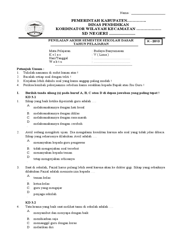 Untuk siswa kelas 4 Sekolah Dasar, semester 2 adalah waktu yang tepat untuk memperdalam pemahaman mereka tentang budaya Banyumasan. Pada usia ini, anak-anak mulai mampu menginternalisasi nilai-nilai, memahami konsep-konsep yang lebih abstrak, dan menunjukkan ketertarikan pada sejarah serta tradisi. Artikel ini akan menyajikan contoh-contoh soal budaya Banyumasan yang komprehensif, mencakup berbagai aspek seperti bahasa, kesenian, makanan khas, dan nilai-nilai luhur, dirancang khusus untuk siswa kelas 4 semester 2. Soal-soal ini dapat digunakan sebagai bahan evaluasi, latihan, atau bahkan sebagai pemicu diskusi di kelas maupun di rumah.